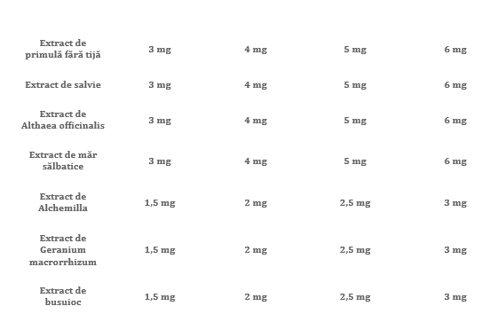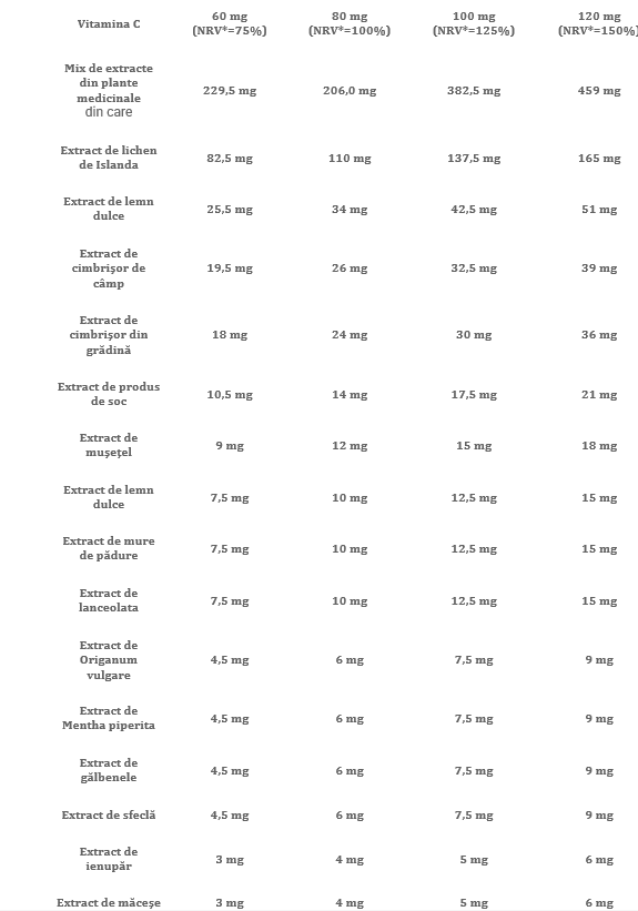 INGREDIENTE : maltodextrina (originar din porumb), agent pentru reglarea acidității (acid citric), aromă (căpșuni), mix de extracte a 22 plante medicinale (extract de lichen de Islanda, extract de lemn dulce, extract de Thymus, extractul fructului de soc, extract de mușețel, extract de lemn dulce, extract de mure sălbatice, extract de Plantago lanceolata, extract de Origanum vulgare, extract de Mentha piperita, extract de gălbenele, extract de boabe de ienupăr, extract de măceșe, extract de primula fără tijă, extract de salvie medicinală, extract de Althaea officinalis, extract de măr sălbatic, extract de Alchemilla, extract de Geranium macrorrhizum, extract de busuioc), acid ascorbic L, îndulcitor (sucraloză, glicozide de stevie), agent antiaglomerare (stearat de calciu).